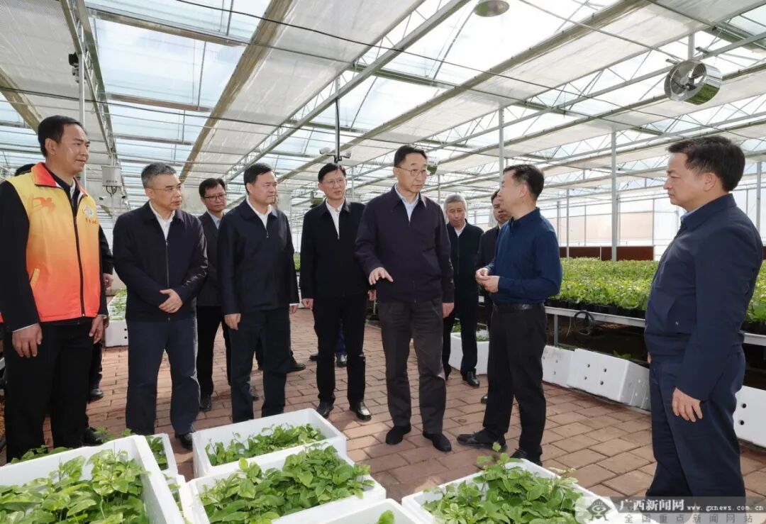 ▲刘宁走进田阳区新建村蔬菜育苗大棚实地考察百香果、圣女果等特色产业发展情况。记者 黄克 摄