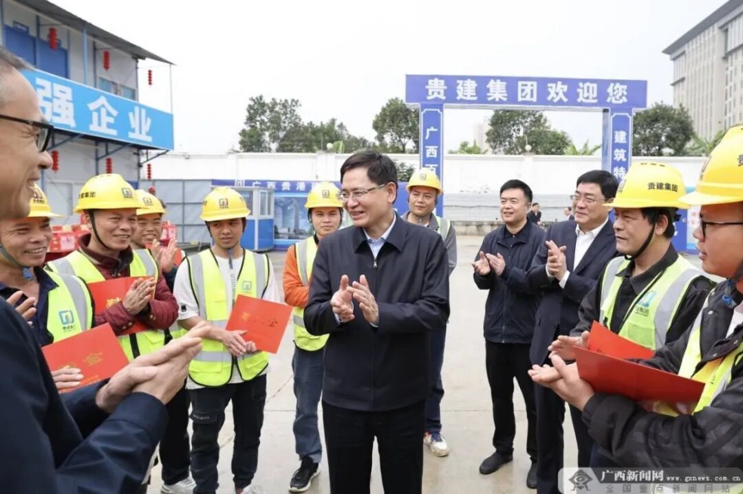 ▲2月2日,自治区主席蓝天立来到贵港市,深入企业、社区、建筑工地等,看望慰问科技人才、优秀楷模、困难党员群众和进城务工人员。在建设中的贵港建设大厦项目,仍有一批工人留守工地过年。蓝天立来到工人们中间,向他们送去慰问品和新年祝福。记者 邓华 摄