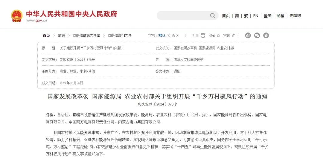 国家发展改革委、国家能源局、农业农村部近日联合印发《关于组织开展“千乡万村驭风行动”的通知》(以下简称《通知》),要求深入落实“四个革命、一个合作”能源安全新战略,锚定碳达峰碳中和目标,实施“千乡万村驭风行动”,促进农村地区风电就地就近开发利用,创新开发利用场景、投资建设模式和收益共享机制,推动风电成为农村能源革命的新载体、助力乡村振兴的新动能,为农村能源绿色低碳转型、建设宜居宜业和美乡村提供有力支撑。