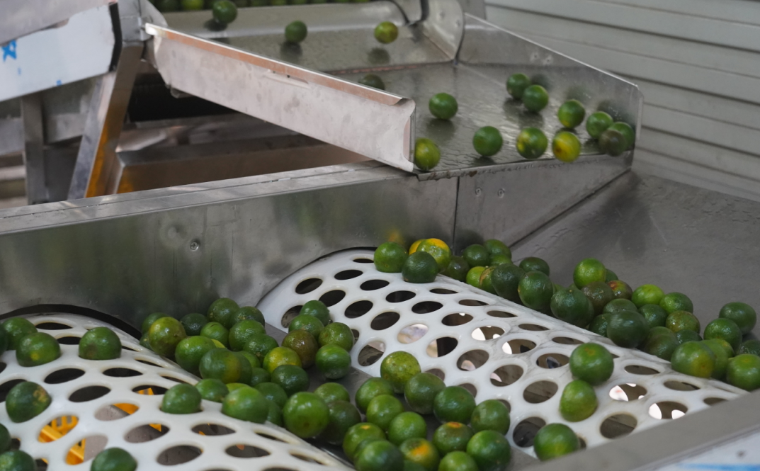 ▲机械化对收购的柑果进行清洗、筛选。